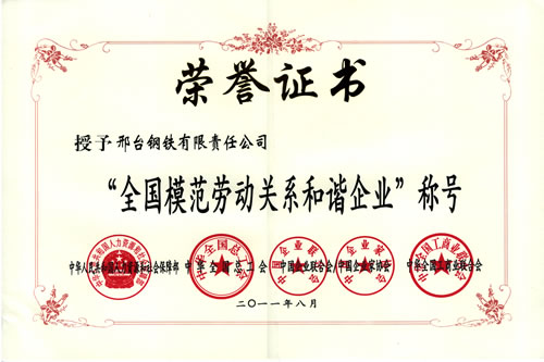 Xingtai Steel was awarded the NationalModel Enterprise of Harmonious Labor Relationship which issued by Ministry of Human Resources and Social Security of the People's Republic of China (MOHRSS), All-China Federation of Labor,China Enterprise Confederation(CEC) and All-China Federation Of Industry & Commerce.