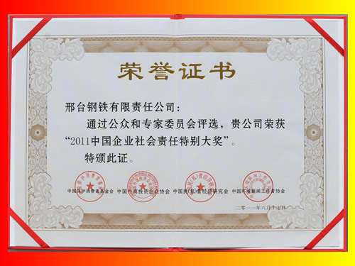 Xingtai Steel received Special Award of Corporate Social Responsibility of China in 2011