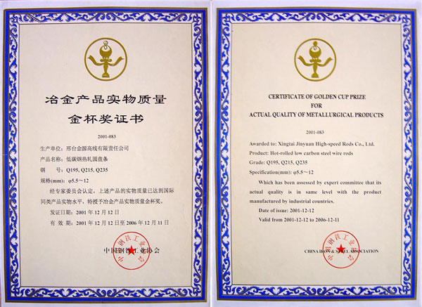 低碳鋼熱軋圓盤條Q195,Q215,Q235獲冶金產(chǎn)品實物質量金杯獎