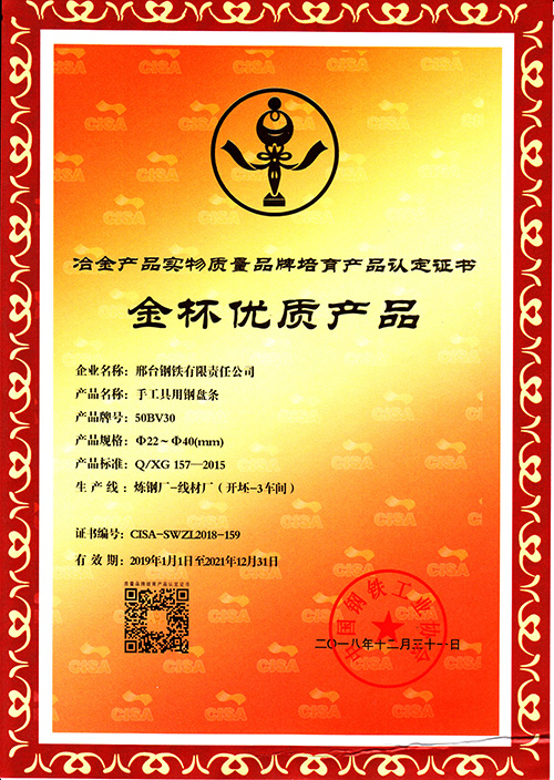 手工具用鋼盤條50BV30φ22-40mm規(guī)格,獲冶金產(chǎn)品實物質(zhì)量金杯優(yōu)質(zhì)產(chǎn)品認定證書。