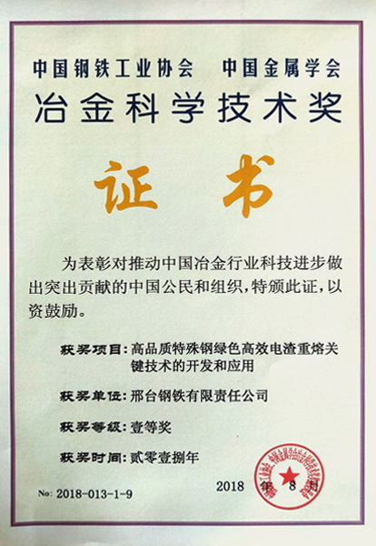 邢鋼高品質(zhì)特殊鋼綠色高效電渣重熔關(guān)鍵技術(shù)喜獲全國冶金科技一等獎
