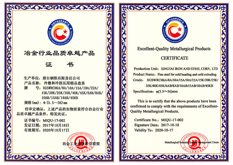 冷鐓和冷擠壓用精品盤條XGSWRCH6A/8A/10A/15A/18A/22A/15K/20K/25K/35K/40K/45K/6AB/8AB/10AB/15AB/18AB/45KB共18個牌號φ5.5- 36mm規(guī)格獲冶金行業(yè)品質(zhì)卓越產(chǎn)品