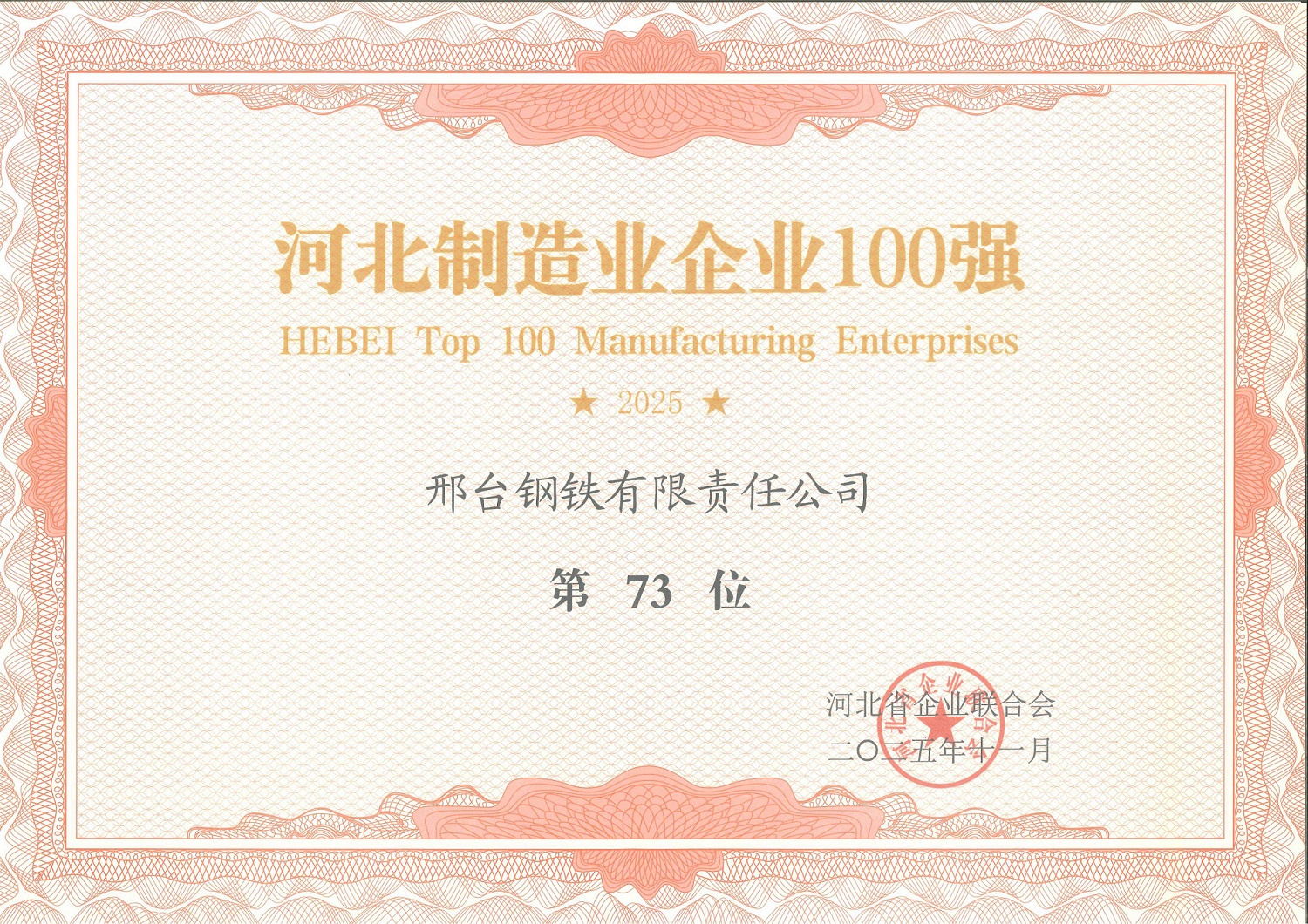 2025 年,邢臺(tái)鋼鐵有限責(zé)任公司榮登 “河北制造業(yè)企業(yè) 100 強(qiáng)” 第 73 位