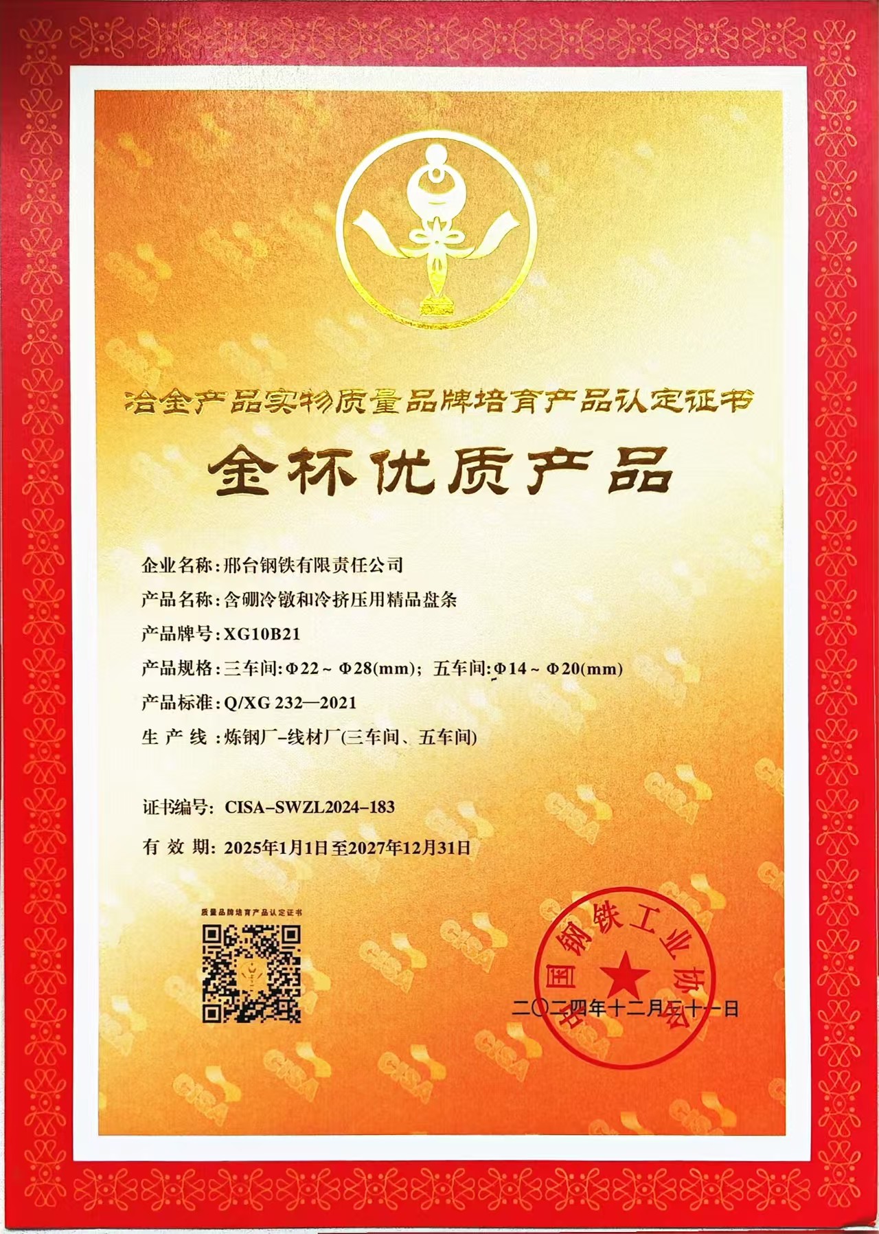 2024年公司含硼冷鐓及冷擠壓用精品盤條XG10B21產(chǎn)品獲得冶金產(chǎn)品實(shí)物質(zhì)量品牌培育產(chǎn)品(金杯優(yōu)質(zhì)產(chǎn)品)認(rèn)定證書,簡稱金杯獎(jiǎng)。“冶金產(chǎn)品實(shí)物質(zhì)量品牌培育”評選活動(dòng)于24年3月啟動(dòng),由中國鋼鐵工業(yè)協(xié)會(huì)主辦,金杯獎(jiǎng)是中國鋼鐵工業(yè)協(xié)會(huì)組織的冶金行業(yè)唯一的比較權(quán)威的獎(jiǎng)項(xiàng),