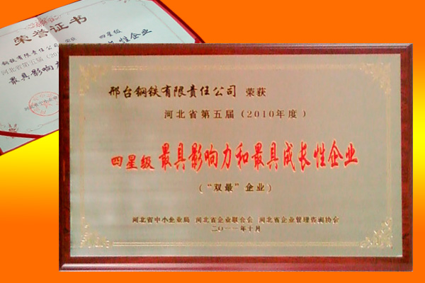 2011年10月,邢鋼榮獲“河北省第五屆(2010年度)四星級(jí)最具影響力和最具成長性企業(yè)”。