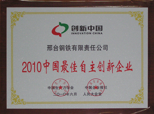 2010年6月,邢鋼榮獲“2010中國最佳自主創(chuàng)新企業(yè)”稱號