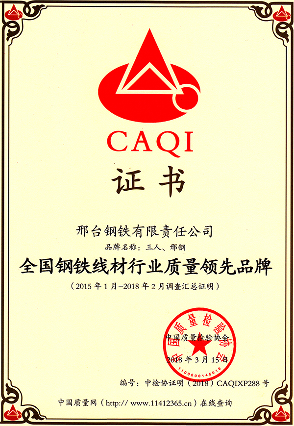 2018年3月15日,邢鋼(主要產(chǎn)品:三人牌純鐵、碳鋼、不銹鋼、軸承鋼系列盤條和熱軋帶肋鋼筋),被中國質(zhì)量檢驗協(xié)會授予“全國產(chǎn)品和服務(wù)質(zhì)量誠信示范企業(yè)”稱號。