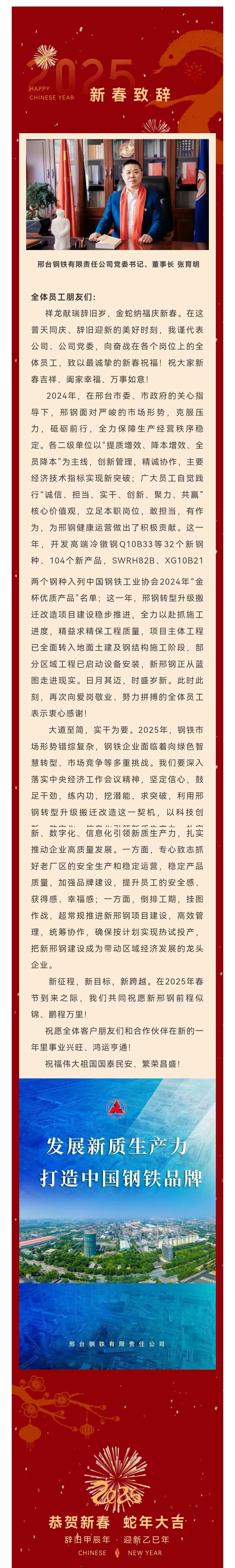 祥龍獻(xiàn)瑞辭舊歲,金蛇納福慶新春。在這普天同慶、辭舊迎新的美好時(shí)刻,我謹(jǐn)代表公司、公司黨委,向奮戰(zhàn)在各個(gè)崗位上的全體員工,致以最誠摯的新春祝福!祝大家新春吉祥、闔家幸福、萬事如意!