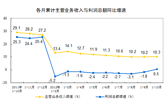1-10月份,全國規(guī)模以上工業(yè)企業(yè)實現(xiàn)利潤40240億元,同比增長0.5%。10月當月實現(xiàn)利潤5001億元,同比增長20.5%。