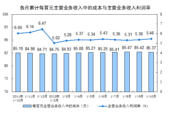 規(guī)模以上工業(yè)企業(yè)實現(xiàn)主營業(yè)務收入736970億元,同比增長10.3%。每百元主營業(yè)務收入中的成本為85.37元,主營業(yè)務收入利潤率為5.46%。