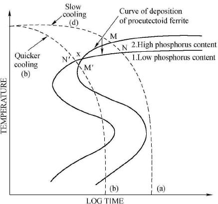上圖曲線1、2分別是高P鋼、低P鋼的恒溫轉(zhuǎn)變曲線,也可以分別表示同一鋼中高P區(qū)和低P區(qū)的恒溫轉(zhuǎn)變曲線。在控制冷卻速率較慢的情況下,如曲線(a)所示,鐵素體將會先在M點(diǎn)形核。因?yàn)镻能夠提高C的活度系數(shù),所以高P區(qū)域C的活度較高,但實(shí)際濃度卻偏低,鐵素體的形核時(shí)會推動C元素向低P區(qū)域、原本C濃度高(活度低)的區(qū)域擴(kuò)散,這樣就會造成C元素偏聚,形成帶狀組織;如果冷卻速率較快,如(b)所示,鐵素體會先在Nˊ點(diǎn)(低P區(qū))形核,促進(jìn)C元素向高P區(qū)域、原來C濃度較低的區(qū)域擴(kuò)散,會使C分布的更加均勻,鐵素體和珠光體都會隨機(jī)形核長大,減弱或抑制帶狀組織形成。