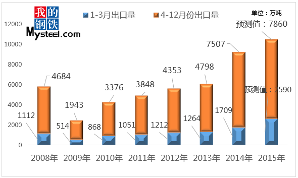 圖表:2008-2015年國內(nèi)鋼材出口量情況及預測