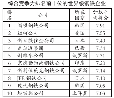 浦項(xiàng)鋼鐵公司在技術(shù)工人熟練程度、技術(shù)創(chuàng)新能力、聯(lián)盟與合資、所在國(guó)家風(fēng)險(xiǎn)等方面獲得10分的滿(mǎn)分,但在獲取鐵礦石、煉焦煤等煉鋼原料和能源成本、國(guó)內(nèi)市場(chǎng)趨于飽和等方面存在明顯短板,得分也相對(duì)較低,該公司以加權(quán)平均7.91分(滿(mǎn)分為10分)繼續(xù)位居榜首,與去年得分相比沒(méi)有變化。