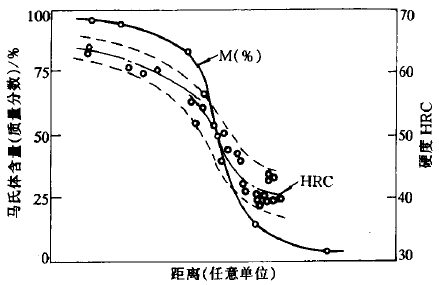 在未淬透的情況下,如何確定工件淬硬層深度呢?從理論上講,淬硬層應(yīng)為全馬氏體組織,但由于金相組織上淬硬區(qū)與非淬硬區(qū)無明顯界限,而馬氏體量由表面到心部是逐漸減少的。實際上馬氏體中混有一定量非馬氏體組織,如5~10%屈氏體時,在顯微觀察及硬度測量上都不易察覺。因此,通常將具有50%馬氏體處確定為淬硬層邊界,即從工件表面到50%馬氏體區(qū)的距離定為淬硬層深度,因為含50%馬氏體區(qū)是硬度值急劇變化的地方,如下圖所示: