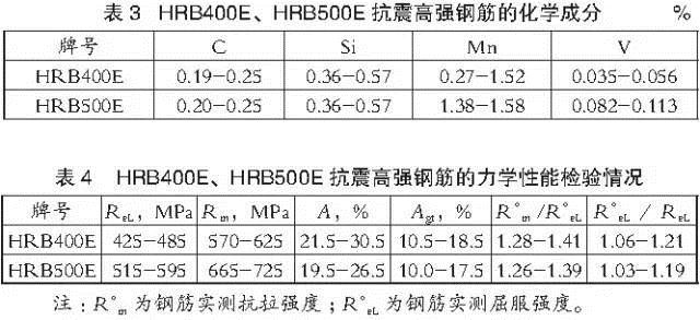 我國在GB 1499.2-2007標(biāo)準(zhǔn)中首次將鋼筋的抗震性能指標(biāo)納入國標(biāo)中,并規(guī)定了抗震鋼筋的三個(gè)代表性指標(biāo):強(qiáng)屈比(R?m /R?eL)、超屈比(R?eL/ReL)和最大力總伸長率(Agt)。國內(nèi)某鋼廠HRB400E、HRB500E抗震鋼筋多樣品檢驗(yàn)獲得的化學(xué)成分和力學(xué)性能指標(biāo)見表3和表4。