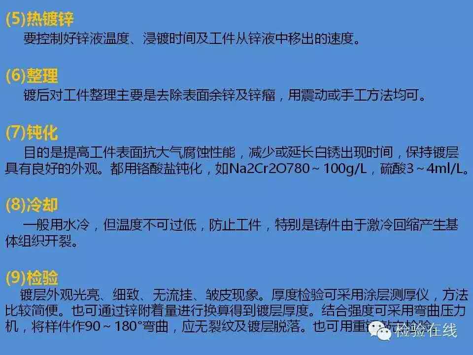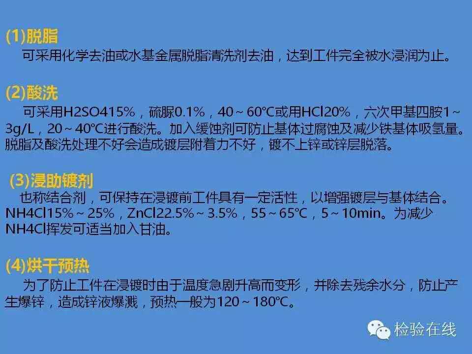 工件→脫脂→水洗→酸洗→水洗→浸助鍍溶劑→烘干預熱→熱鍍鋅→整理→冷卻→鈍化→漂洗→干燥→檢驗