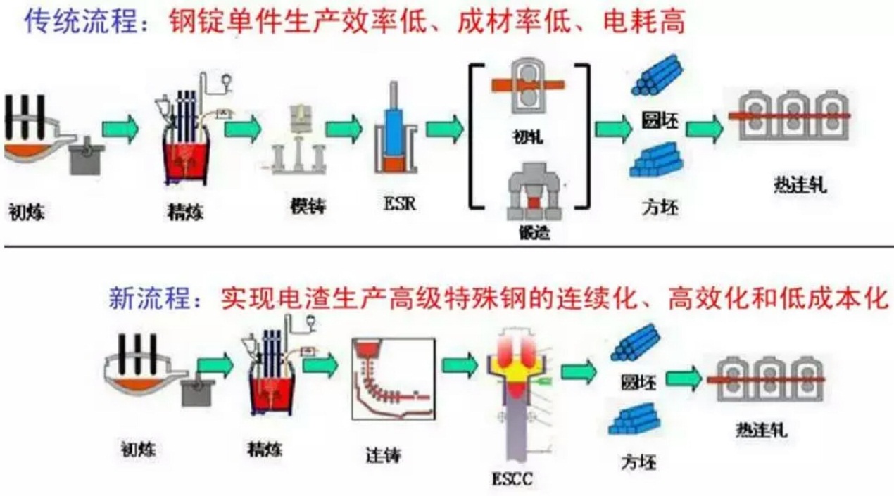 為解決電渣重熔技術(shù)電耗較高、批量少管理不便、生產(chǎn)效率低等局限性特點,冶金工作者也在不斷的創(chuàng)新和完善電渣重熔技術(shù),如電渣連鑄技術(shù):