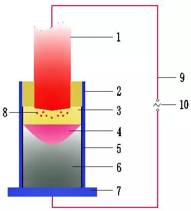 1-自耗電極;2-水冷結(jié)晶器;3-渣池;4-金屬熔池;5-渣殼;6-鋼錠;7-底水箱;8-金屬熔滴;9-變壓器;10-大電流導體