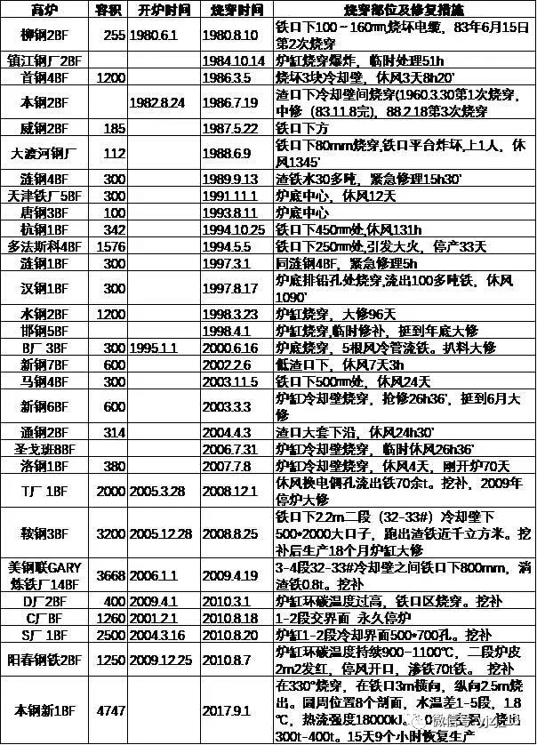 以下針對(duì)國(guó)內(nèi)外典型高爐爐缸燒出案例進(jìn)行統(tǒng)計(jì),并對(duì)燒出原因、修復(fù)和維護(hù)等方面進(jìn)行詳細(xì)的說明,為國(guó)內(nèi)外高爐的長(zhǎng)壽提供技術(shù)和數(shù)據(jù)參考。