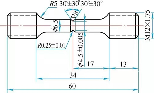 第三,試樣的制造。按圖沿材料的順纖維方向加工試樣,粗加工后熱處理至所要求的抗拉強(qiáng)度,然后精加工至規(guī)定尺寸,缺口用中軟細(xì)粒氧化鋁砂輪磨制。磨削時(shí)應(yīng)保證缺口根部半徑圓滑。磨削后投影檢查,確保缺口尺寸符合圖紙要求。逐根測(cè)量缺口根部直徑(圖中為φ4.5?0.05mm)的尺寸,并做好編號(hào)記錄。