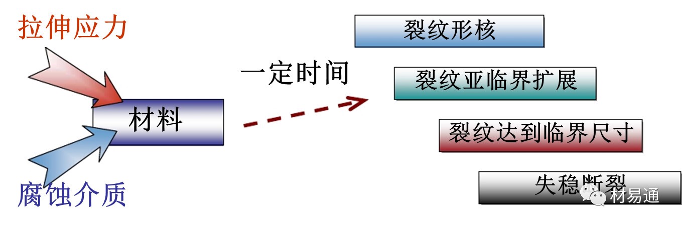 整個斷裂時間與材料、介質(zhì)、應(yīng)力有關(guān)(短則幾分鐘,長可達若干年,應(yīng)力降低,斷裂時間延長。