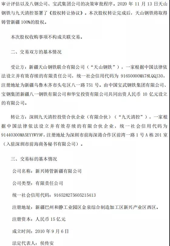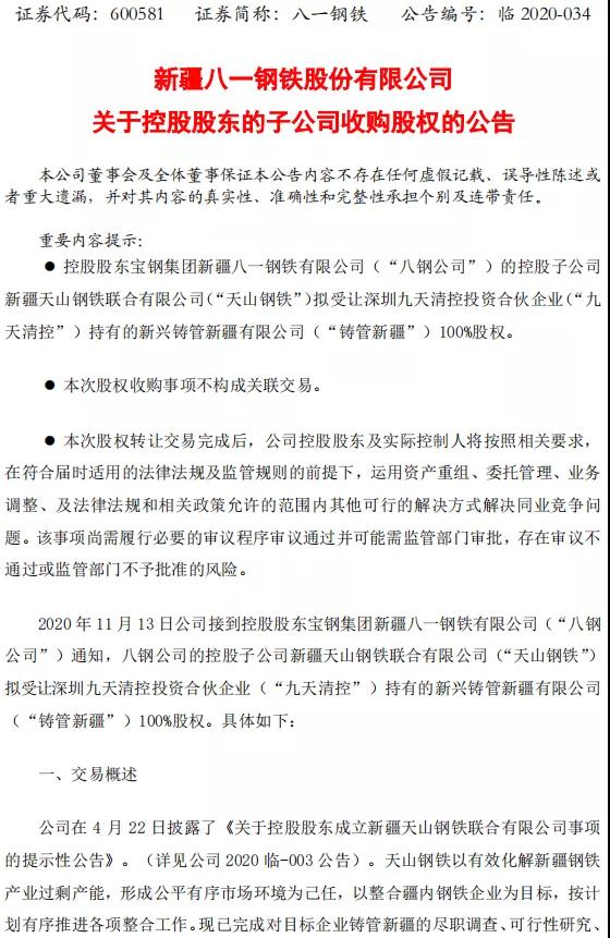11月13日晚間,八一鋼鐵發(fā)布公告稱,該公司控股股東寶鋼集團(tuán)新疆八一鋼鐵有限公司的控股子公司新疆天山鋼鐵聯(lián)合有限公司擬受讓深圳九天清控投資合伙企業(yè)持有的新興鑄管新疆有限公司100%股權(quán)。11月13日,天山鋼鐵與九天清控簽署了《股權(quán)轉(zhuǎn)讓協(xié)議》。本次股權(quán)轉(zhuǎn)讓以2019年12月31日為基準(zhǔn)日,以公司經(jīng)天健會計(jì)師事務(wù)所審計(jì)、北京中企華資產(chǎn)評估有限責(zé)任公司評估后的100%股權(quán)價值為基礎(chǔ),各方協(xié)商確定本次股權(quán)轉(zhuǎn)讓價款為21.81億元。