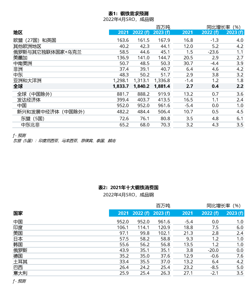 世界鋼鐵協(xié)會今日發(fā)布最新版短期(2022年-2023年)鋼鐵需求預測報告。該報告顯示,全球鋼鐵需求繼2021年增長2.7%之后,將在2022年繼續(xù)增長0.4%,達到18.402億噸。2023年,全球鋼鐵需求還將繼續(xù)增長2.2%,達到18.814億噸。在俄烏沖突的背景下,當前的預測結(jié)果存在高度的不確定性。