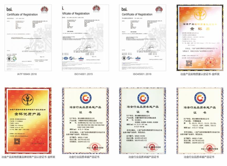 1999年邢鋼開始推行質(zhì)量管理體系,成為最早一批通GB/T19000族標(biāo)準(zhǔn)過認(rèn)證的鋼企之一。2006年,作為全國首批鋼鐵企業(yè),邢鋼全流程通過了英標(biāo)認(rèn)證公司TS16949汽車行業(yè)質(zhì)量管理體系。產(chǎn)品研發(fā)也是芝麻開花節(jié)節(jié)高,通過創(chuàng)新研發(fā)模式相繼開發(fā)了汽車用鋼、鐵路用鋼,高強(qiáng)橋梁用鋼,耐候鋼、重熔鋼等產(chǎn)品,涵蓋冷鐓鋼、彈簧鋼、軸承鋼、純鐵、預(yù)應(yīng)力鋼、易切削鋼、工模具鋼、耐候鋼等十八大系列。如今的邢鋼已經(jīng)通過EMS,OHSMS等9個(gè)體系認(rèn)證!