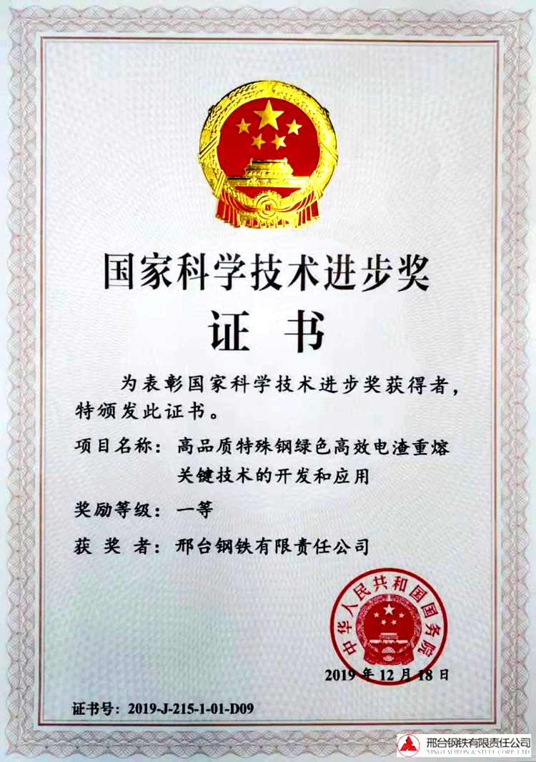 2019邢鋼“高品質(zhì)特殊鋼綠色高效電渣重熔關(guān)鍵技術(shù)的開發(fā)和應(yīng)用”還榮獲國家科學(xué)技術(shù)進(jìn)步獎(jiǎng)一等獎(jiǎng)。