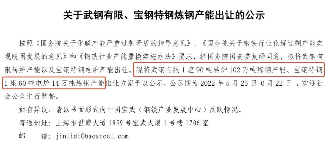 按照《國務(wù)院關(guān)于化解產(chǎn)能嚴(yán)重過剩矛盾的指導(dǎo)意見》、《國務(wù)院關(guān)于鋼鐵行業(yè)化解過剩產(chǎn)能實(shí)現(xiàn)脫困發(fā)展的意見》和《鋼鐵行業(yè)產(chǎn)能置換實(shí)施辦法》要求,經(jīng)國務(wù)院國資委復(fù)函同意,擬將武鋼有限轉(zhuǎn)爐產(chǎn)能以及寶鋼特鋼電爐產(chǎn)能出讓?,F(xiàn)將武鋼有限1座90噸轉(zhuǎn)爐102萬噸煉鋼產(chǎn)能、寶鋼特鋼1座60噸電爐14萬噸煉鋼產(chǎn)能出讓方案予以公示,公示期為2022年5月25日-6月22日,歡迎社會(huì)公眾進(jìn)行監(jiān)督。