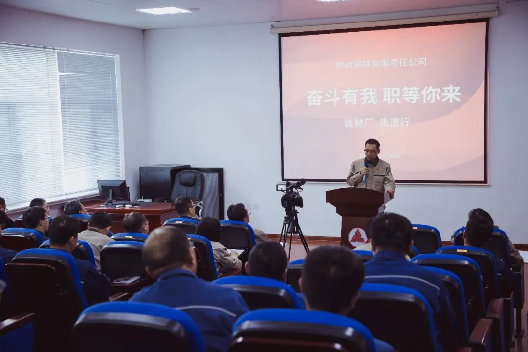 為加強員工隊伍建設,提供人才晉升渠道,實施動態(tài)儲備,4月16日,邢鋼組織開展了“奮斗有我,職等你來”主題演講會,倡議廣大青年員工立足崗位比奉獻,積極為公司發(fā)展諫言獻策,并激勵他們錘煉品德、勇于創(chuàng)新、實學實干,和公司一起成長,成為邢鋼事業(yè)發(fā)展的中堅力量。公司董事長兼黨委書記張育明等公司領導及各單位主管領導參與了本次活動。