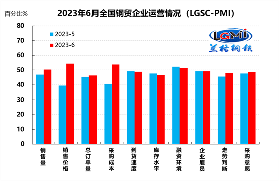 蘭格鋼鐵網(wǎng)統(tǒng)計(jì)發(fā)布的2023年6月份鋼鐵流通業(yè)PMI總指數(shù)為49.6%,比上月上升1.8個(gè)百分點(diǎn),在收縮區(qū)間內(nèi)繼續(xù)回升。從分類指數(shù)看,構(gòu)成鋼鐵流通業(yè)PMI的10個(gè)分類指數(shù)6升3降1平,其中銷售量、銷售價(jià)格、總訂單量、采購成本、走勢(shì)判斷和采購意愿6項(xiàng)指數(shù)上升,到貨速度、庫存水平和融資環(huán)境3項(xiàng)指數(shù)下降,企業(yè)雇員1項(xiàng)指數(shù)持平。