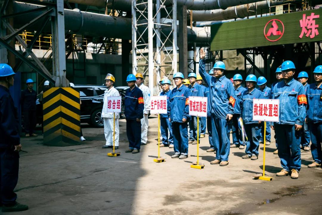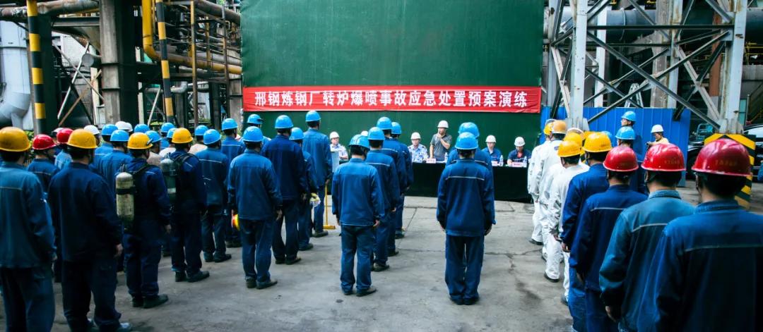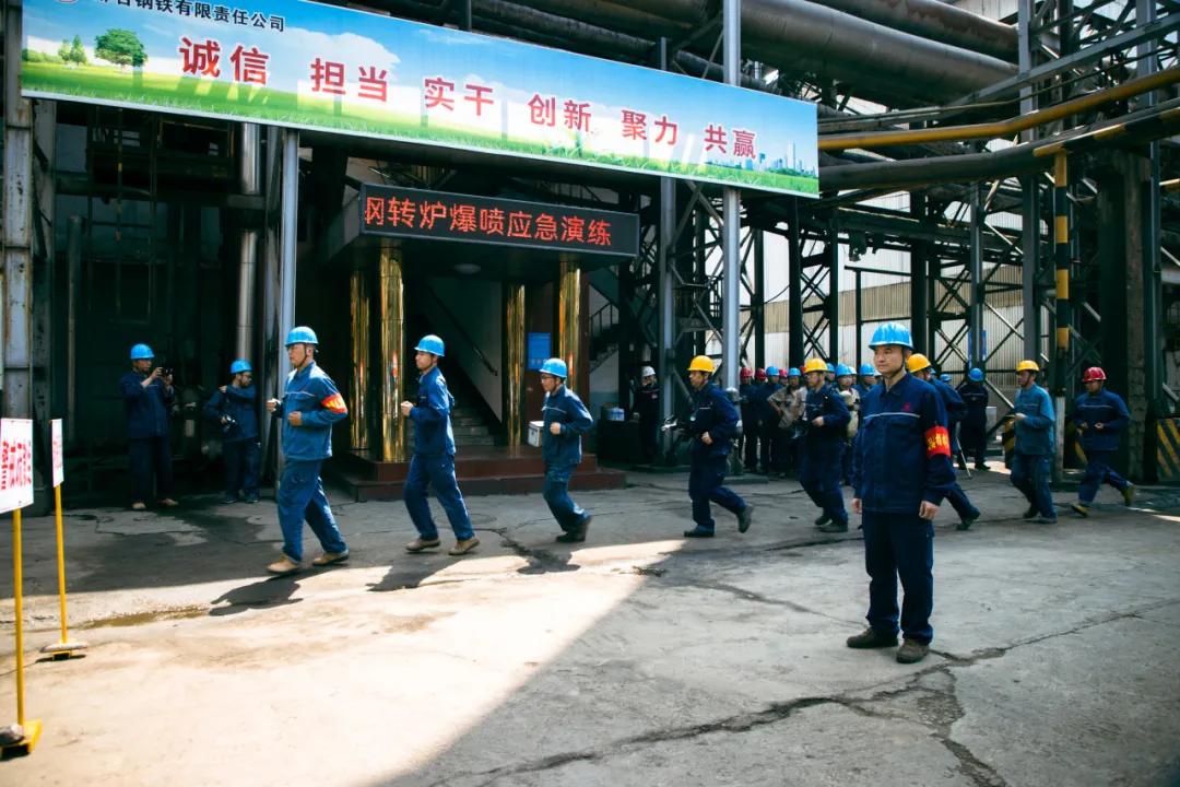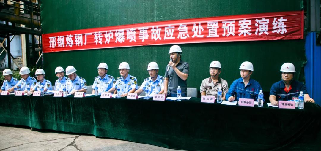 隨后,參會人員一起現(xiàn)場觀摩了邢鋼高溫熔融金屬爆噴事故現(xiàn)場應(yīng)急處置演練。本次演練,模擬煉鋼廠加料跨天車向2#轉(zhuǎn)爐加廢鋼時發(fā)生爆噴為背景,演示了事故上報、安全疏散、預(yù)案啟動、現(xiàn)場搶險、應(yīng)急救援等環(huán)節(jié)。