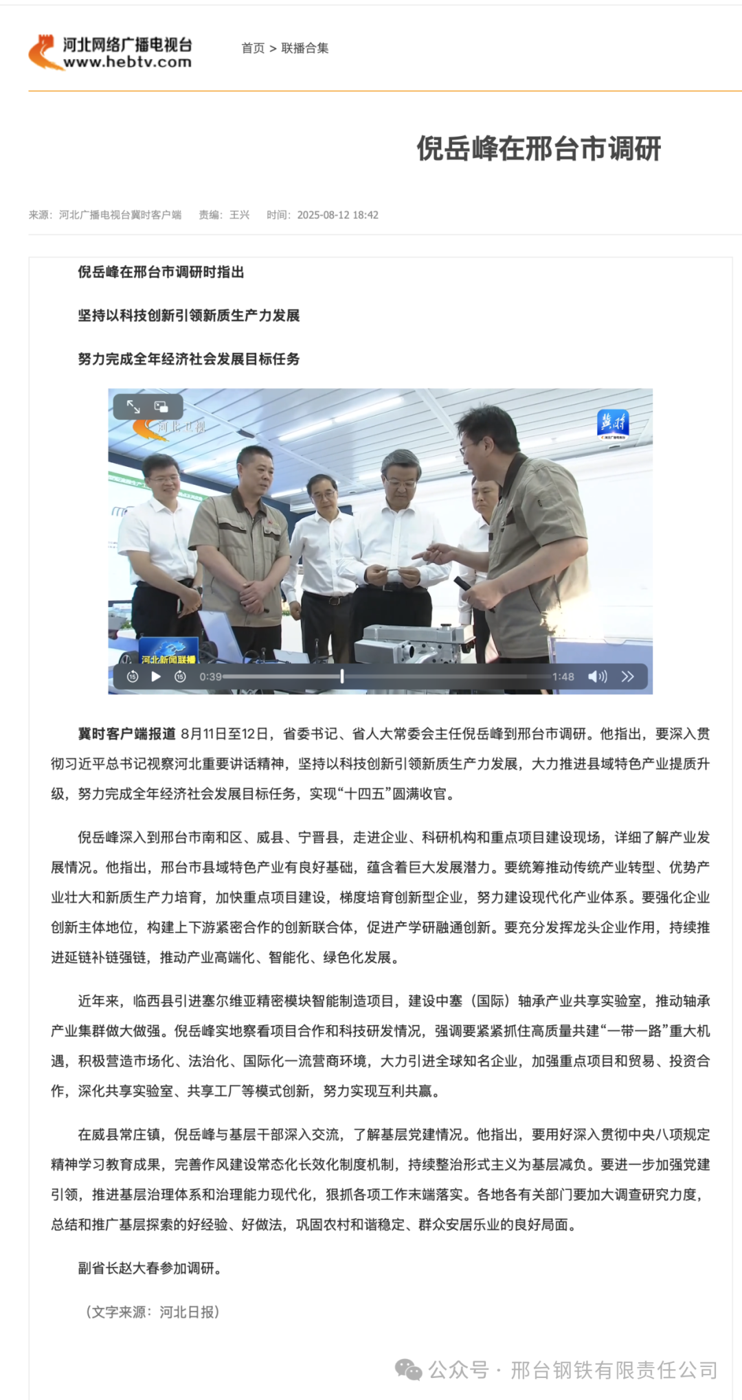 冀時客戶端報道 8月11日至12日,省委書記、省人大常委會主任倪岳峰到邢臺市調(diào)研。他指出,要深入貫徹習(xí)近平總書記視察河北重要講話精神,堅(jiān)持以科技創(chuàng)新引領(lǐng)新質(zhì)生產(chǎn)力發(fā)展,大力推進(jìn)縣域特色產(chǎn)業(yè)提質(zhì)升級,努力完成全年經(jīng)濟(jì)社會發(fā)展目標(biāo)任務(wù),實(shí)現(xiàn)“十四五”圓滿收官。